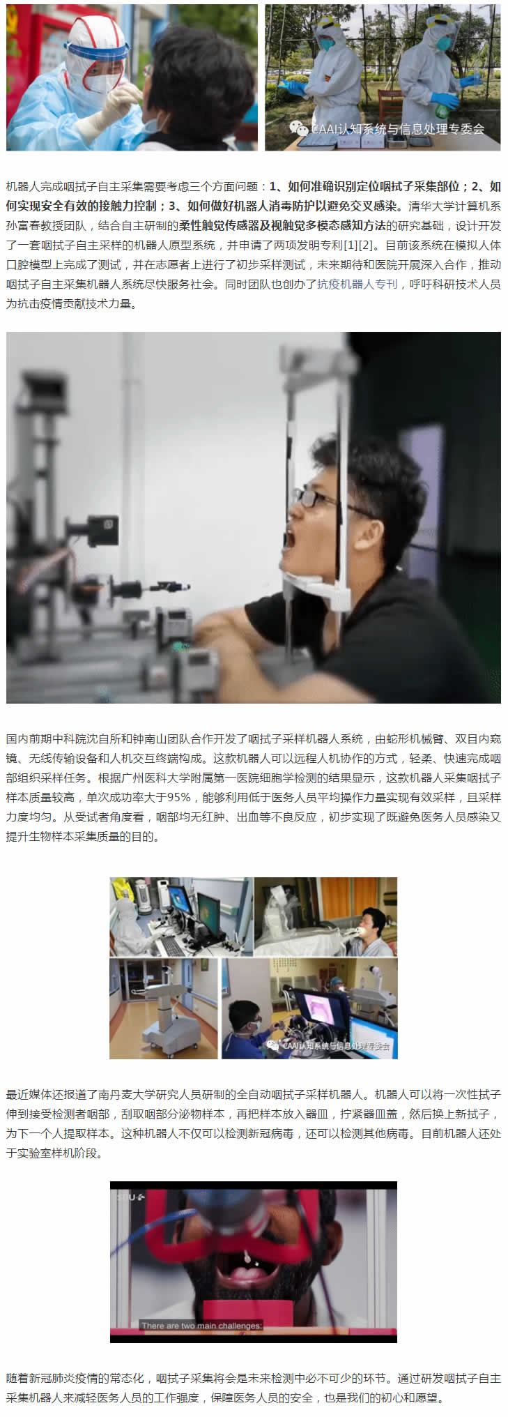 新G肺炎的三項(xiàng)檢測(cè)包括核酸檢測(cè)、血常規(guī)和胸部CT。其中常用的是核酸檢測(cè),而咽拭子是主要采樣方法。咽拭子采樣操作過(guò)程中醫(yī)務(wù)人員須與患者近距離接觸,患者咳嗽、用力呼吸等可產(chǎn)生大量飛沫或氣溶膠,具有較G交叉感染的風(fēng)險(xiǎn),因此醫(yī)務(wù)人員在采集咽拭子時(shí)需要穿防護(hù)服。前幾日北京的G溫,醫(yī)護(hù)人員穿著密不透風(fēng)的防護(hù)服為大家采集咽拭子樣本,又曬又熱又悶,工作強(qiáng)度非常大,因此亟需改善醫(yī)護(hù)人員的工作方式。疫情爆發(fā)以來(lái),機(jī)器人L域的研究人員逐漸投入研發(fā)咽拭子自主采集機(jī)器人。