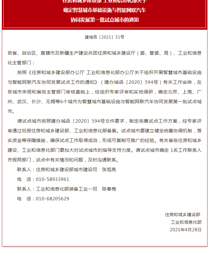 按照有關(guān)工作安排,在各城市申報(bào)和省J主管部門審核基礎(chǔ)上,經(jīng)組織專家評(píng)審和實(shí)地調(diào)研,兩部門確定北京、上海、廣州、武漢、長(zhǎng)沙、無(wú)錫6個(gè)城市為智慧城市基礎(chǔ)設(shè)施與智能網(wǎng)聯(lián)汽車協(xié)同發(fā)展D一批試點(diǎn)城市。