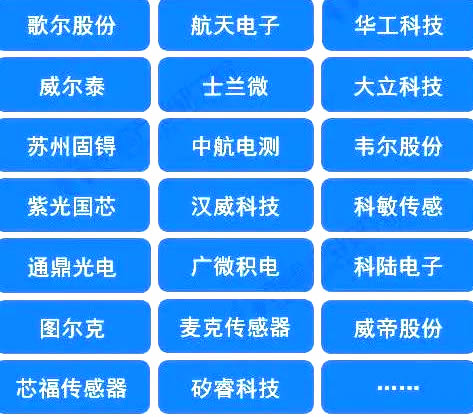 華工科技 航天電子 歌爾股份 大立科技 士蘭微 威爾泰 韋爾股份 蘇州固锝 中航電測 科敏傳感 漢威科技 紫光國芯 科陸電子 通鼎光電 廣微積電 圖爾克 威帝股份 麥克傳感器 矽睿科技 芯福傳感器