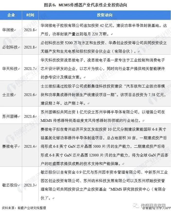 2021年以來,MEMS傳感器產業代表性企業的投資動向主要包括收購公司拓展業務、通過對子公司增資的方式投資MEMS傳感器生產基地項目。MEMS傳感器產業代表性企業新投資動向如下: